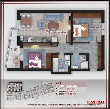 STU - SUPRAFAȚA TOTALĂ UTILĂ: 72 mp,SUPRAFAȚĂ TERASE/BALCOANE: 5 mp