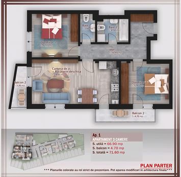 STU - SUPRAFAȚA TOTALĂ UTILĂ: 75 mp,SUPRAFAȚĂ TERASE/BALCOANE: 8 mp
