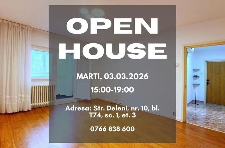 Vino la Open House, pe data de 03.03.2026, in intervalul 15:00-19:00, sa-ti prezentam un apartament de 3 camere, pe Str. Deleni, nr. 10, bl. T74, sc. 1, situat la etajul 3 din 8, bloc construit in 1986. Apartamentul are o suprafata utila totala de 79,63 mp, cu un balcon de 4,68 mp, este decomandat, confort 1. Blocul este amplasat intr-o zona accesibila si aerisita, in apropierea parcurilor Tei si parcul Circului, acest apartament va ofera avantajul accesului rapid la diverse puncte de interes (metrou Obor, iesirea spre Autostrada A3, Facultatea de Constructii, zona de birouri Aviatiei). Piata locala (Obor) si unitatile comerciale sunt, de asemenea, la o distanta comoda, asigurandu-va accesul la produse proaspete si alte necesitati. Statiile de tramvai, autobuz si metrou din apropiere va vor conecta rapid cu restul orasului, facand calatoriile zilnice mai usoare. Se accepta si plata cu credit. Va asteptam la vizionare! Comision 0%!