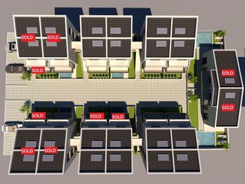 Despre complex: locuințele sunt disponibile în două tipuri (parter 39 mp și mezonetă 59 mp). Finisaje și dotări anunțate: pardoseli din gresie, scări interioare/exterioare din marmură albă, tâmplărie eficientă energetic din aluminiu, plase pentru insecte, ușă de securitate, termoizolație 8 cm. Fiecare locuință este predată cu baie și bucătărie echipate, boiler solar și sistem de alarmă. Permis de construcție emis în 07/2025; finalizarea proiectului este estimată pentru sfârșitul anului 2026. Unele apartamente la parter pot avea piscină privată și parcare privată.