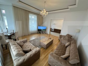 Apartamentul este inundat de lumină naturală, datorită ferestrelor generoase care străpung fațada istorică. Această luminozitate este amplificată de albul imaculat al mobilierului și de transparența perdelelor diafane, care par să filtreze nu doar lumina, ci și ritmul orașului, lăsând în urmă doar o liniște profundă.
