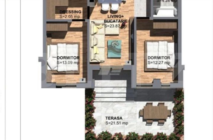 Compartimentare: 3 camere, 2 băi, logie, terasă 18,38 mp