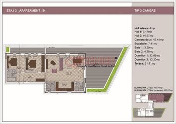Este impartit astfel, 100 de metri patrati utili plus o terasa de 63 metri patrati. Fiind amplasat la etajul 3, apartamentul beneficieaza de liniste si intimitate.