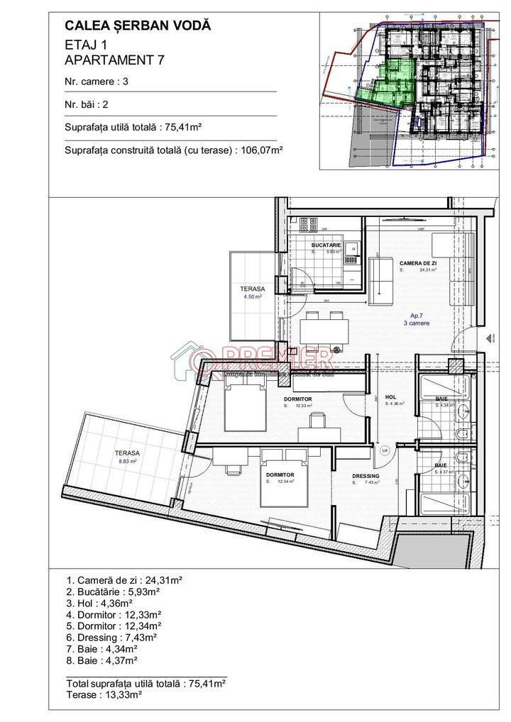 STU - SUPRAFAȚA TOTALĂ UTILĂ: 88.74 mp,SUPRAFAȚĂ TERASE/BALCOANE: 13.33 mp