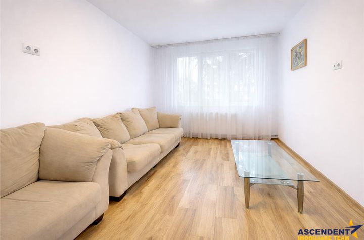 Proprietatea , mobilata si utilata, se desfasoara pe o compozitie particularizata, decomandat configurata cu living generos, bucatarie inchisa cu iesire pe balcon, doua dormitoare, hol, baie cu aerisire naturala si dresing.