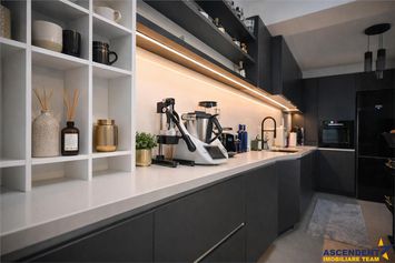 Bucataria gourmet dispune de blat si contrablat din piatra naturala, iar electrocasnicele Bosch, renumite pentru performanta, fac din gatit o experienta eficienta. Racitorul dublu Haier, cu capacitate pentru 100 de sticle, expresorul DeLonghi si Thermomix-ul sunt detalii care completeaza perfect aceasta arie gastronomica.