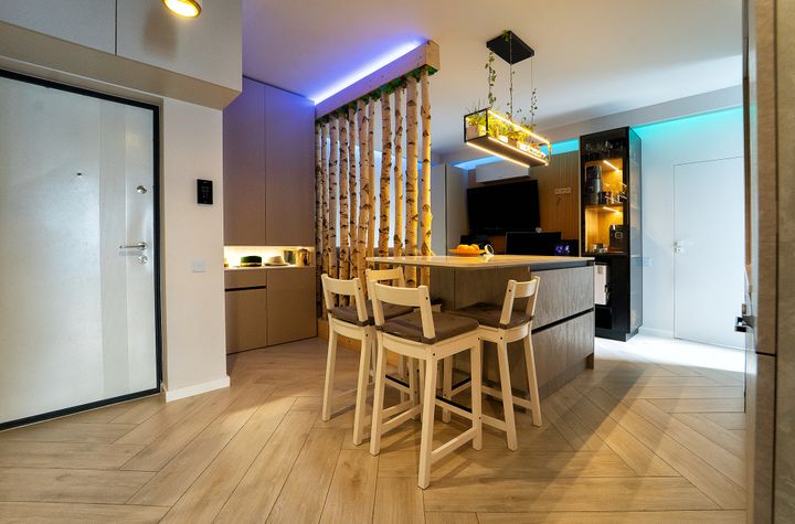 Compartimentarea este eficientă și bine gândită: living luminos cu bucătărie open space, două dormitoare (dormitor matrimonial și cameră pentru copil) și baie complet echipată. Interiorul este amenajat cu atenție la detalii, folosind materiale premium și mobilier realizat pe comandă.