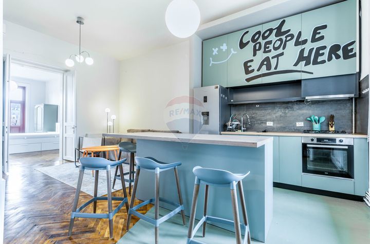 Situat intr-o zona ultracentrala, pe o strada cu trafic redus, apartamentul se remarca prin inaltimea impresionanta a tavanelor, de peste 3 metri, care confera spatiului luminozitate si un aer nobil. Usile inalte din lemn masiv se armonizeaza perfect cu parchetul din lemn masiv, conturand un ambient elegant si distins.
