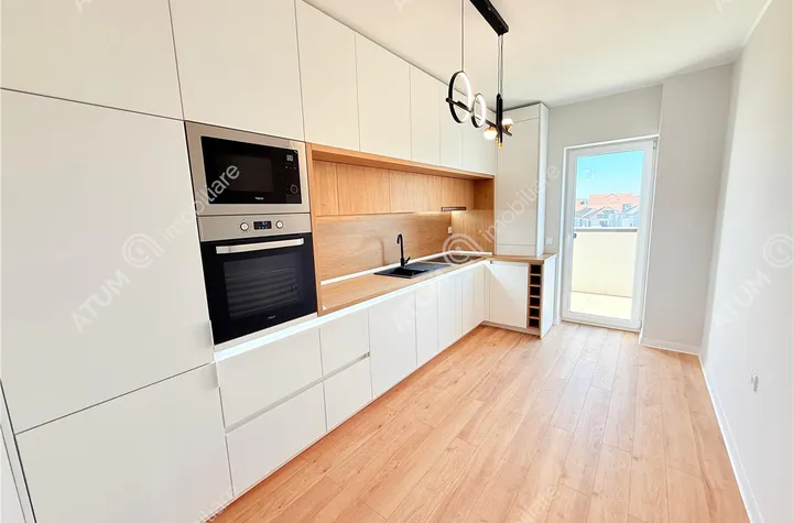 Suprafata exterioara generoasa reprezinta unul dintre atuurile majore ale proprietatii. Apartamentul dispune de o terasa spectaculoasa de 40 mp, cu o panorama catre Muntii Fagaras si Dealul Daii, un spatiu ideal pentru relaxare, zona de dining in aer liber sau amenajare decorativa, intr-un cadru deschis si neobturat de constructii invecinate, datorita regimului redus de inaltime al cladirilor din zona.