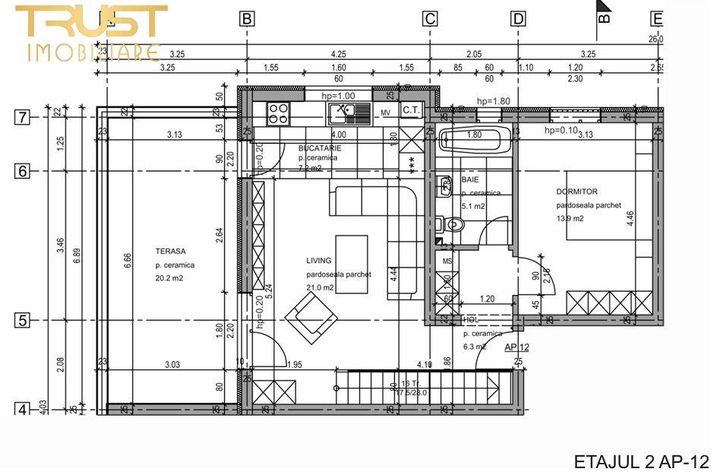 La etajul 2 este un dormitor decomandat, hol, bucatarie, living generos, bucatarie si o terasa de 20 MP.