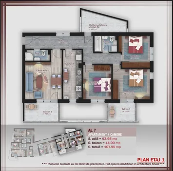 STU - SUPRAFAȚA TOTALĂ UTILĂ: 108 mp,SUPRAFAȚĂ TERASE/BALCOANE: 14 mp