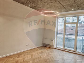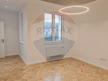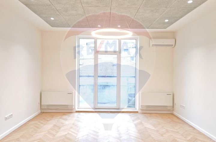 Spatiul este renovat complet si include finisaje si dotari actuale: usi Filomuro, convectori pentru incalzire si racire cu programare, obiecte sanitare premium, corpuri de iluminat LED, ferestre cu geam triplu pentru izolare termica eficienta, gresie si faianta import, parchet din lemn natural reconditionat si lacuit, tavan cu panouri fonoabsorbante. Suprafetele vitrate generoase ofera lumina naturala si un ambient aerisit.