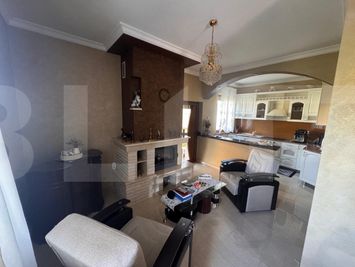 Interiorul este amenajat la cele mai înalte standarde: 10 camere spațioase, dintre care 5 dormitoare elegante, o bucătărie open space modernă, 2 băi complet echipate, o sală de jocuri la mansardă și multiple spații de depozitare. Finisajele premium includ trepte și contratrepte din marmură, balustradă din inox, travertin, parchet, gresie, șemineu și zugrăveală decorativă „antic”. Proprietatea se vinde complet mobilată și utilată lux, fiind gata pentru a fi locuită imediat.
