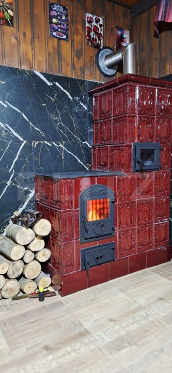 • Design Interior Remarcabil: Spre deosebire de cabanele clasice, interiorul surprinde printr-o amenajare eclectică și rafinată. De la soba spectaculoasă din teracotă roșie — piesa centrală a casei — până la finisajele premium din băi (baterii negre mate, lavoare pe blat de lemn masiv și placări ceramice stil patchwork), fiecare detaliu este gândit pentru a crea o atmosferă caldă și primitoare.
