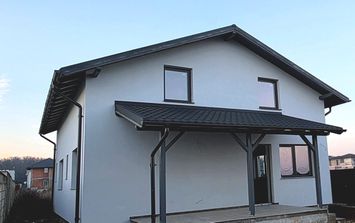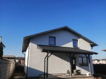 Construcția este realizată cu atenție la detalii și materiale de calitate superioară: fundație din beton armat, termo și hidroizolată, structură pe cadre de beton, pereți din cărămidă Porotherm de 25 cm, placă de beton peste parter, izolație exterioară cu polistiren EPS80 de 10 cm și acoperiș din tablă Lindab, culoare antracit.