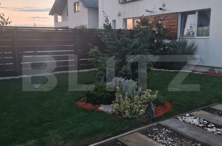 Curtea este amenajata complet cu plante si arbusti ornamentali.