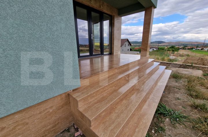 Interiorul cuprinde 3 dormitoare luminoase, 2 băi moderne, un living spațios cu bucătărie deschisă și un garaj cu acces direct în casă.