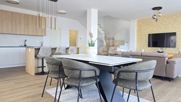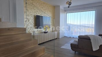 Proprietatea este organizată pe mai multe niveluri, oferind spațiu, lumină naturală prin geamurile mari și intimitate. Casa beneficiază de panouri fotovoltaice de 12 kW, pompă de căldură și încălzire electrică, soluții care asigură eficiență energetică și costuri optimizate. Conexiunea wireless este disponibilă la fiecare nivel.