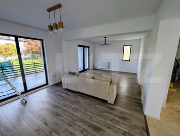 Parter: living spațios, bucătărie modernă, baie și zonă de acces către terasă