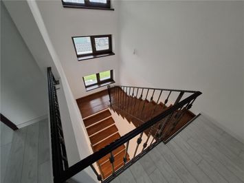 La etaj sunt 3 dormitoare din care unul cu baie proprie, camera pentru spalat si uscat haine o baie mare si un balcon cu vederea catre curtea interioara a casei.