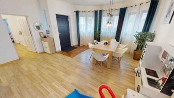 Living generos si luminos, bucatarie cu insula și loc de dining, 3 dormitoare, 2 bai, camara, camera tehnica si terasa de 30 mp. Spatiul este organizat practic, potrivit pentru o familie.
