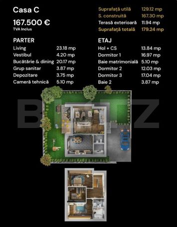 - Parter: vestibul, living, bucatarie&dining, grup sanitar, spatiu depozitare, camera tehnica