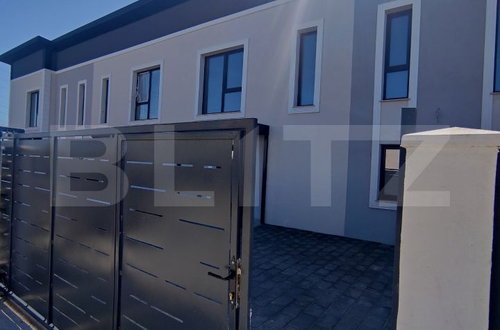 Exteriorul este amenajat cu trotuare pavate și platformă pentru parcare auto, oferind atât funcționalitate, cât și un aspect îngrijit și modern.