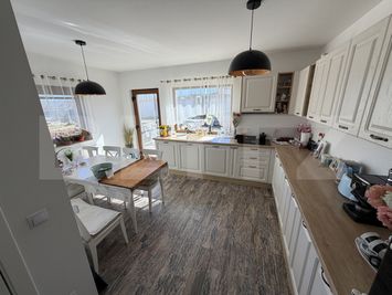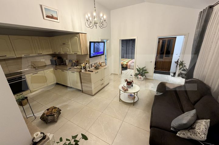 Locuința este compartimentată eficient și beneficiază de două zone funcționale distincte: corp principal cu living și bucătărie open-space, dormitoare și baie, plus un corp secundar ce include bucătărie spațioasă, baie și spațiu tehnic/depozitare. În plus, proprietatea dispune de cameră suplimentară la nivel superior și terasă exterioară, oferind multiple posibilități de utilizare.