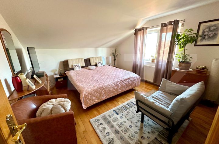 La parter, te întâmpină o bucătărie modernă, complet utilată, alături de un living impresionant, inundat de lumină naturală, ideal pentru momentele de relaxare sau socializare. Tot la parter, vei găsi o cameră multifuncțională și o baie elegantă, gândită pentru a adăuga un plus de confort. Accesul către etaj se face pe o scară amplă, unde te așteaptă două dormitoare rafinate, perfecte pentru odihnă și relaxare. Dressingul, generos ca dimensiune, poate fi transformat cu ușurință într-un birou privat, oferind flexibilitate în utilizare. O a doua baie, modern echipată, desăvârșește confortul etajului, iar balconul închis, cu vedere panoramică, devine un loc ideal pentru relaxare în orice anotimp.