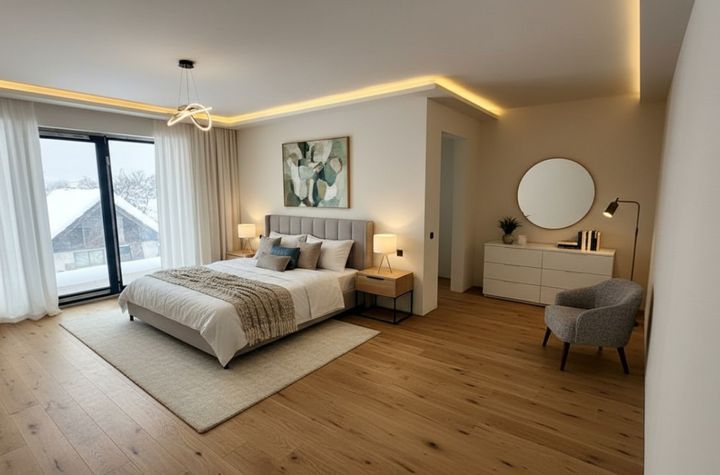 Configurație modernă: 5 camere (3 dormitoare), 3 băi, bucătărie închisă și cameră tehnică.