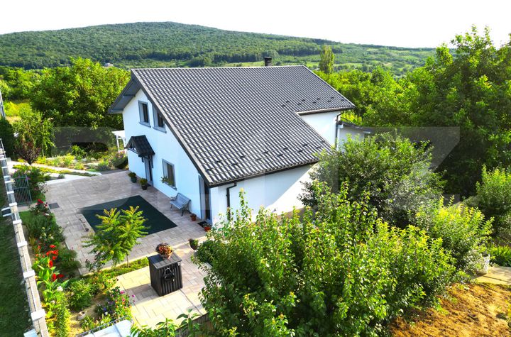 Curte și peisaj natural: Cu o curte generoasă de 1000 mp, amenajată cu pietre naturale, cioate de copac și flori, casa este înconjurată de frumusețea naturii, creând o atmosferă de relaxare și liniște.