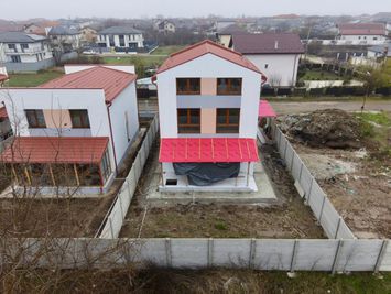 Terenul total pe care este construita casa este de 313mp, iar amprenta este de 77mp (fara terasa). Vila este conectata la gaz si curent.
