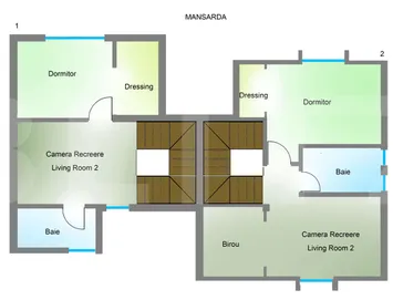 Casa este impartita pe parter, etaj si mansarda , dispune de 5 camere 3 dressinguri 4 bai bucatarie si living open space.
