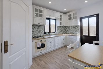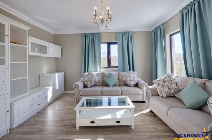 Spatiile interioare impresioneaza prin luminozitate si armonie: living elegant in nuante neutre, cu accente clasice si priveliste catre dealurile din imprejurimi, bucatarie complet utilata in stil