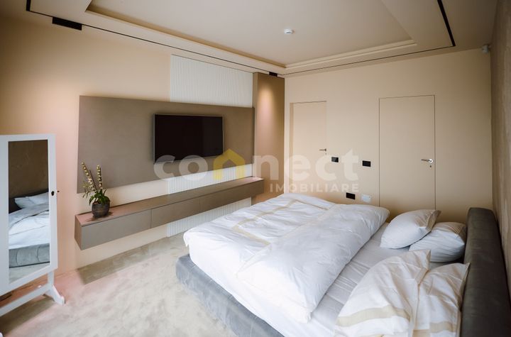 Dormitorul matrimonial are acces către un dressing generos, la care se ajunge coborând pe o scară din lemn masiv. Dressingul are 60 mp, este realizat la comandă, cu vitrine fumurii și iluminare LED și este completat de o baie de 22 mp, luminoasă și bine proporționată. Aici se mai găsesc încă un dormitor, două băi și o bucătărie complet utilată, cu ieșire pe terasă. Terasa oferă o vedere plăcută asupra orașului, potrivită pentru cine apreciază un moment de pauză și un cadru deschis.