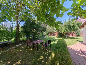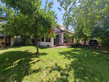 O curte inundată de verdeață, pomi fructiferi, o boltă deasă de viță care oferă umbra mult căutată în zilele toride de vară, trandafiri înfloriți , de toate acestea te poți bucura dacă alegi să locuiești aici.