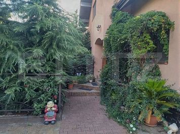 • Spațiu verde îngrijit, cu brazi și plante ornamentale.