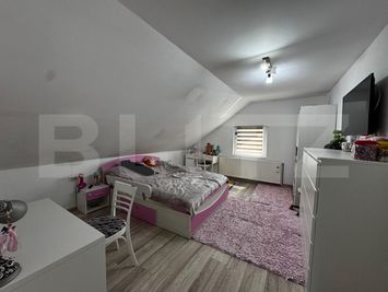 Proprietatea se află pe un teren generos de 585 mp și este dispusă pe subsol, parter și mansardă, oferind compartimentare practică și funcțională. Locuința beneficiază de 5 dormitoare, un dressing generos, living luminos, 2 băi, bucătărie spațioasă cu cămară, precum și un garaj dublu, ideal pentru familiile cu mai multe autovehicule.