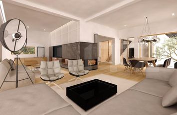 Arhitectura modernistă, liniile curate și materialele folosite oferă casei un aer contemporan, elegant și atemporal, iar suprafețele vitrate generoase contribuie la o atmosferă luminoasă și primitoare.