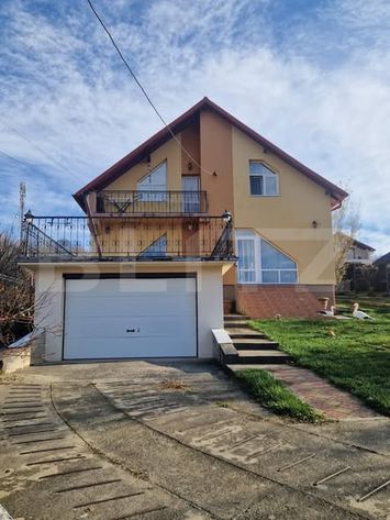Accesul pe proprietate se face pe un driveway pavat, ce urcă armonios până la scara casei și către garajul generos, deasupra căruia este amenajată o terasă imensă, perfectă pentru relaxare, seri cu prietenii sau momente de liniște în aer liber. Casa dispune de 7 camere, dintre care 4 dormitoare, 2 băi, spații ample și luminoase, finisaje solide și o structură robustă, construită pentru confortul unei familii.