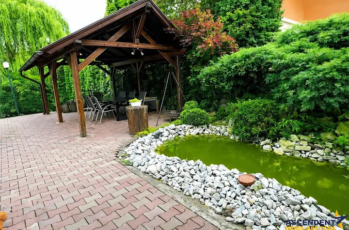 Curtea proprietatii, cu o suprafata de peste 1000 mp, este un spatiu viu, extrem de bine ingrijit, unde vegetatia ornamentala, stancile decorative, micul helesteu si zona de gratar creeaza o atmosfera de relaxare si rafinament. Foisorul adauga un plus de confort pentru momentele petrecute in aer liber. Siguranta este sustinuta de un sistem de supraveghere video care monitorizeaza zona exterioara.