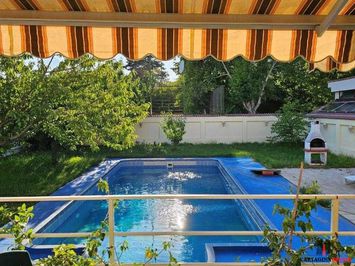 Gradina are vegetație matura (pomi fructiferi si plante decorative) iar piscina este funcțională (luciu de apa 5x10 M, adâncime maxima 2,5 M), conectate pentru apa la sursa proprie (put forat).