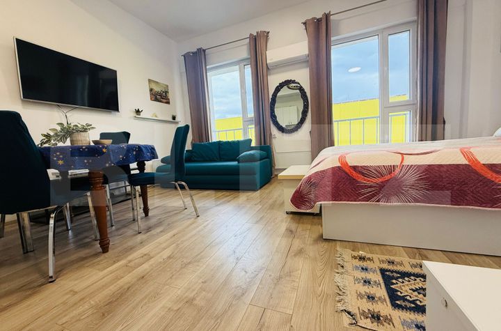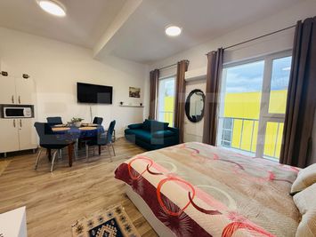 Garsoniera dispune de un spațiu eficient compartimentat, luminos și primitor, cu finisaje moderne și mobilier ales cu grijă pentru a oferi confort maxim. Bucătăria este complet echipată, incluzând plită electrică, hotă, frigider și cuptor cu microunde, toate în stare foarte bună de funcționare.