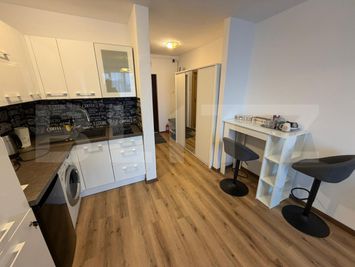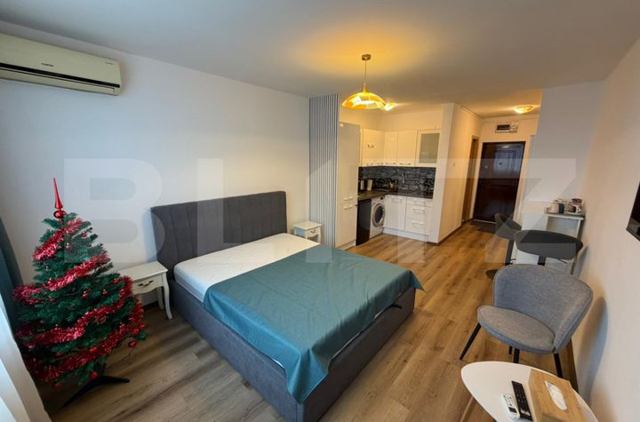Proprietatea se află la etajul 6 al unui imobil cu 10 niveluri, oferind o vedere panoramică deosebită către centrul orașului și zona McDonalds. Locuința a fost renovată integral, beneficiind de finisaje moderne și de o refacere completă a instalației electrice. Confortul este asigurat de dotări actuale, precum apometre cu citire la distanta și electrocasnice noi. Garsoniera se vinde complet mobilată și utilată, fiind dotată cu televizor, aparat de aer condiționat, frigider, mașină de spălat cu uscător, cuptor cu microunde, plită electrică, toaster, fierbător și uscător de păr.