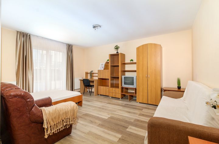 Apartamentul este decomandat si se compune dintr-un hol la intrare cu cuier si oglinda, apoi pe partea dreapta avem baia care este cu cada, in stanga holului gasim un dormitor spatios cu iesire pe balcon, si tot din hol se intra tot in fata in bucatarie, care este inchisa.