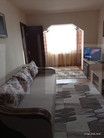 Amenajare: Spațiu mobilat modern, cu un living generos ce include o canapea extensibilă și corpuri de depozitare bine organizate.