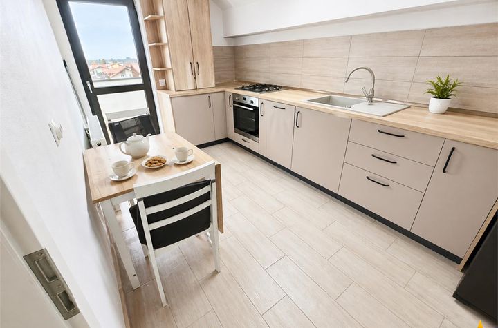 Garsoniera decomandata, orientare SV, suprafata utila 36 mp + terasa 10 mp, constructie 2020. Loc de parcare inclus cu carte funciara. Imobil izolat exterior, clasa energetica B, centrala termica Saunier Duval, incalzire prin calorifere, geamuri termopan Salamander cu 3 foi de sticla, gri antracit, costuri mici la incalzire. Acoperis izolat si acoperit cu tigla, placa de beton intre garsoniera si acoperis, spatiu de depozitare accesibil si posibilitate de extindere deasupra camerei cu o camera mansardabila. Se vinde mobilata si utilata, cu bucatarie echipata cu plita pe gaz, cuptor electric, masina de spalat vase, combina frigorifica, mobilier soft-close, spatii de depozitare si chiuveta granit. Baie cu aerisire naturala, dus walk-in, sanitare Hansgrohe si Roca, masina de spalat rufe. Camera cu coltar extensibil si mobila Laguna, hol cu usa metalica si mobilier Laguna. Finisaje: gresie, parchet, lavabila alba. Utilitati: gaz, curent, internet, cablu TV, canalizare.