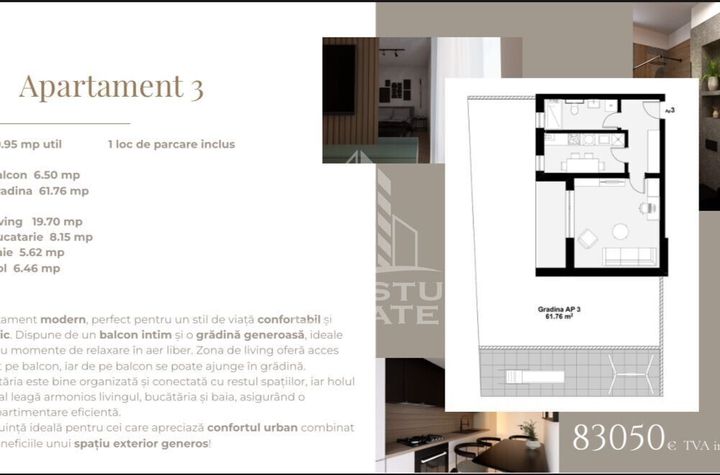 Suprafata utila a apartamentului este de 40 mp + bacon de 7 mp + gradina de 62 mp.