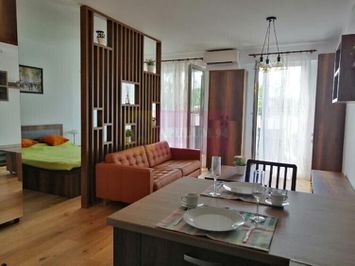 Studioul are centrala proprie , incalzire in pardoseala; plita si cuptor electric, frigider, masina de spalat vase, hota, unele noi, altele putin folosite, aer conditionat.