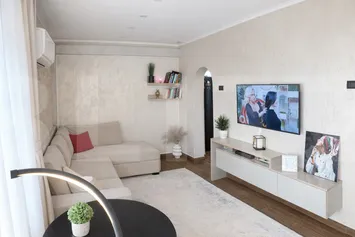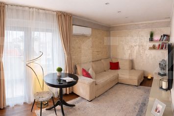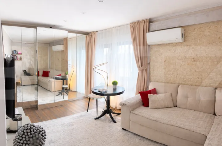 Imobilul este renovat integral, cu finisaje premium, realizate calitativ și funcțional, evidențiindu-se prin finisaje cu piatră naturală și travertin, iar mobilierul este realizat la comandă, adaptat perfect dimensiunilor spațiului, cu multiple soluții de depozitare și inserții de oglinzi care creează senzația unui spațiu generos și luminos.